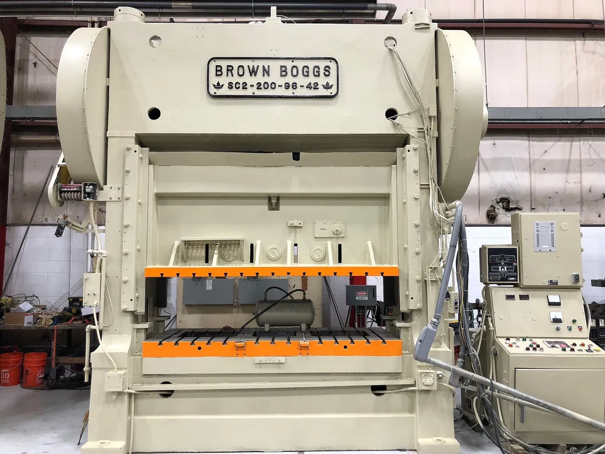Brown and Boggs 200 Ton Straight Side Twin End, Backshaft Driven Mechanical Press, 40-80 SPM.
