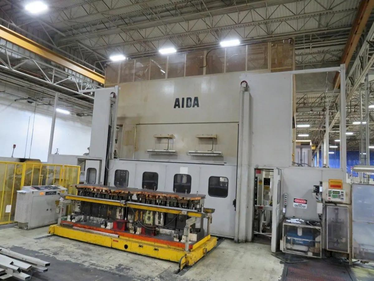 Aida 550 US Ton Straight Side Mechanical Press, Model#: TMX-S2-500, 153.54" x 47.24" bed area, 20" stroke, 15-30 SPM, Dual Rolling Bolsters